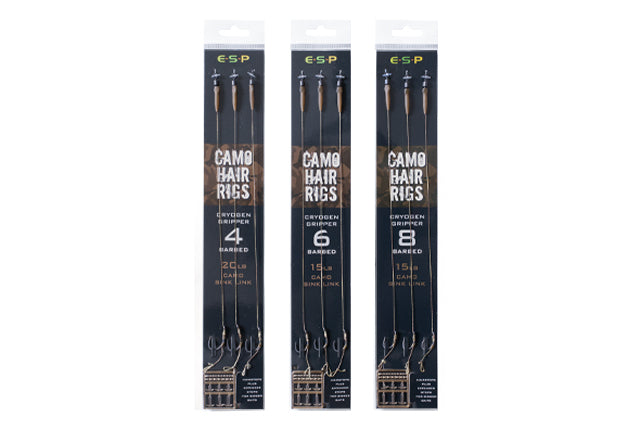 Expertly tied to exacting standards using ESP Camo Sink Link braid and ultra-sharp and durable Cryogen Gripper hooks. The integrated Streamliner Rig Sleeve over the size 9 swivel helps prevents tangles on the cast. Optimum hair length in relation to the hook size, Hair Stops and Extender Stops are included. The Extender Stops are very handy if a larger bait is required or for snowman type baits.